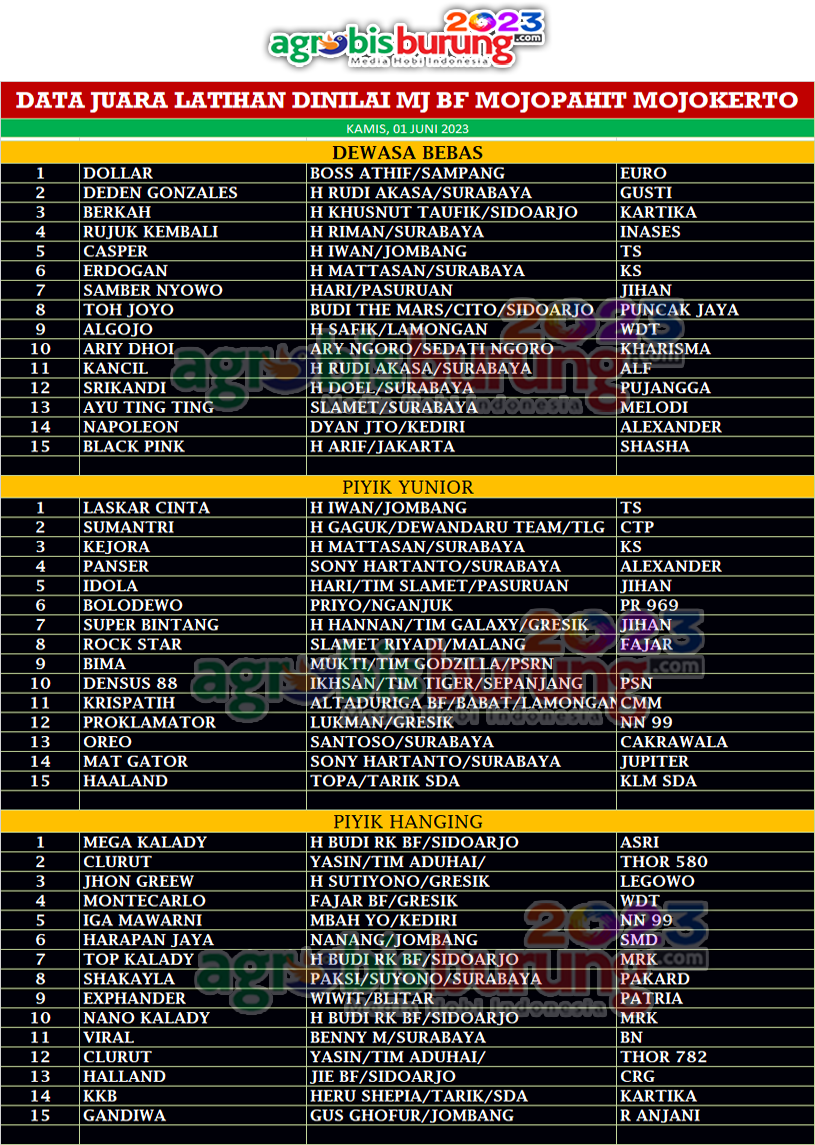 Dan di kelas piyik hanging, debutan belia Mega Kalady bergelang Asri milik H Budi RK Sidoarjo menjadi yang terbaik pertama, kemenangan ini juga menandai transaksi jawara Mega Kalady yang diboyong oleh H Budi dari tangan Tony Dhetira. Disusul oleh Clurut bergelang Thor dan Jhon Greew bergelang Legowo yang merebut posisi kedua dan ketiga. AB-END