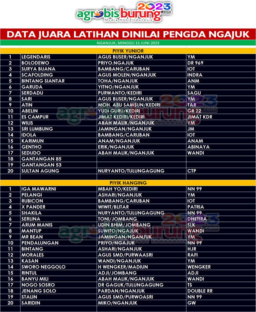 Sementara itu jalannya latihan dinilai sangat seru, dimasing masing kelas dengan daftar kejuaraan sampai 20 ini memang memberikan penghargaan kepada para peserta yang sudah hadir menenteng jawaranya berlomba. Di kelas piyik debutan muda Legendaris milik Asus Buser Ngajuk bergelang YM Ngajuk menjadi bintang keren di kelasnya, tampil dengan kemampuan di atas rata rata mampu dengan mudah melahap babak demi babak untuk menyodok ke podium pertama. Bolodewo bergelang DR dan Surya Buana bergelang IOT yang juga tampil seru hanya bisa mengimbangi laju Legendaris dan harus puas di posisi kedua dan ketiga.