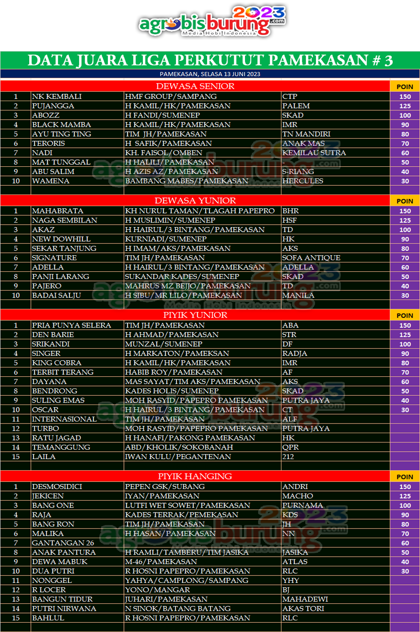PAMEKASAN, agrobisburung.com – Gelaran Liga Perkutut Pamekasan (LPP) # 3 yang di gelaran Pengcam Galis Pamekasan pada Selasa (13/06) tetap menjadi ajang yang seru bagi kungmania Pamekasan. Walau digelar di hari Selasa pesertanya tetap luar biasa, full blok semuanya tanpa tersisa bahkan Arif BRT, ketua LPP 2023 mengatakan bahwa antusias kungmania untuk mengikuti seri LPP terus meningkat dan antusiasnya sangat bagus. Bahkan kungmania Pamekasan saat ini sedang berlomba untuk berburu burung hebat untuk diturunkan di seri LPP 2023 untuk menjadi gengsi tersendiri. “Terima kasih kepada pengcam yang sudah melaksanakan jadwal serinya dan untuk gelaran selanjutnya pengcam pengcam bisa selalu berkoordinasi dengan saya dan juga pengda Pamekasan. Karena keberhasilan untuk memajukan perkututan di Pamekasan adalah tanggung jawab kita bersama,” ucap Arif BRT pada agrobisburung.com