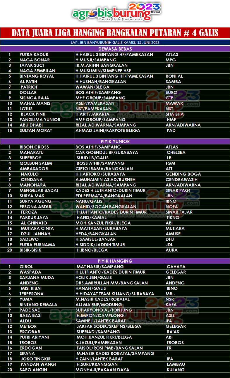 BANGKALAN, agrobisburung.com – Liga Hanging Bangkalan # 4 yang digelar pengcam Galis pada Kamis (15/06) di lapangan JBN BF Galis Bangkalan menjadi agenda yang menarik di seri tersebut, pasalnya penambahan dua kelas dewasa bebas dan piyik yunior membuat jalannya lomba semakin seru. Holik JBN, yang mewakili tuan rumah mengatakan penambahan kelas di liga hanging Bangkalan karena memenuhi permintaan kungmania untuk membuka kedua kelas tersebut. “Dan alhamdulillah kelas piyik hanging tetap full pesertanya dan kelas tambahan dewasa bebas dan piyik yunior juga full persertanya. Terima kasih kepada kungmania yang hadir di Galis dan selamat kepada para pemenang,” ucap Holik pada agrobisburung.com