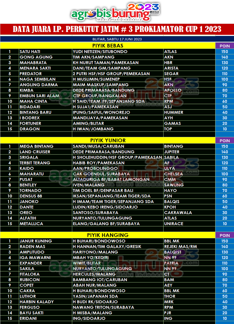 Di kelas piyik hanging, debutan belia asal Bondowoso bernama Janur Kuning milik H Buhari Bondowoso memberikan bukti kehebatan jago miliknya. Menempuh jarak yang lebih dari 5 jam menuju Blitar tidak membuat Janur Kuning bergelang BBL MK ini ciut nyalinya. Sejak peluit dimulainya Liga Jatim Janur Kuning langsung mengemas kemenangan gemilang. Raden Mas bergelang RM dan Amplitudo bergelang Balqist yang juga baru pertama kali turun di seri LP Jatim langsung menunjukkan kelasnya menyodok di tiga besar. AB-END
