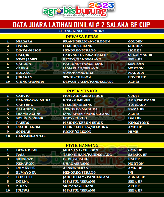 SERANG, agrobisburung.com – Latihan dinilai di markas Tornado BF Serang Banteng pada Minggu (18/06) menjadi ajang seru untuk pra LPI # 5 yang akan di gelar sepekan lagi di Tangerang dan ajang latihan menjadi bagian memanaskan mesin mesin tarung baru untuk menjadi yang terbaik. JokoTrisza, ketua bidang lomba pengda Tangerang mengatakan bahwa latihan dinilai di daerahnya kembali dirutinkan apalagi jelas LPI di Tangerang membuat agenda kali ini sangat seru 3 blok yang dibuka panitgia pesertanya full yang hadir dari Serang ,Cilegon ,Pandeglang ,Tanggerang ,Jakarta, Rangkas . Dan untuk pendukung dan Sponsor latihan dinilai kali ini adalah SALAKA BF Pandeglang.