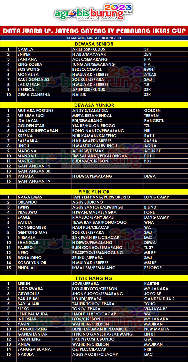 PEMALANG, agrobisburung.com – Gelaran LP. Jateng Gayeng seri IV 2023 berlabel Pemalang Iklas Cup 2023 pada Minggu (18/06) di lapangan Pengda Pemalang (area wisata pantai Widuri) menjadi ajang pertarungan seru jago jago blok tengah yang dari waktu ke waktu semakin berbobot kualitasnya. Seperti di kelas dewasa senior, penampilan Camila bergelang 3F milik Arief SSK Kudus yang tampil the best mampu menyodok ke podium pertama setelah mengalahkan Sniper bergelang ZEN dan Santana bergelang PA yang menempati podium kedua dan ketiga.