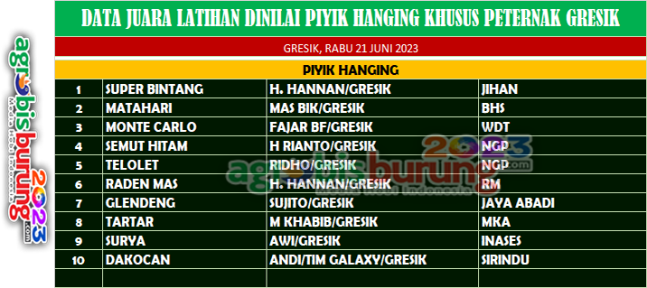 Dan kali ini yang jadi bintang lapangan adalah jawara Super Bintang bergelang Jihan milik H Hannan yang tetap di jalur juara, jawara tersebut tampil joss di latihan dinilai Rabuan dan berhak untuk menempati posisi pertama. Disusul Matahari bergelang BHS dan Monte Carlo bergelang WDT menempati posisi kedua dan ketiga. AB-END