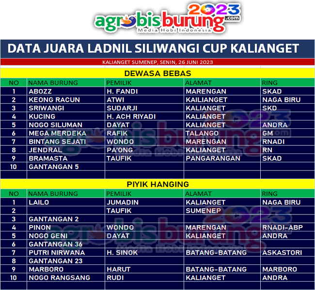 SUMENEP, agrobisburung.com – Latihan dinilai kungmania Kalinget dan sekitarnya berjalan meriah, gelaran yang dilaksanakan di Lap. Siliwangi Kalianget tersebut langsung diserbu kungmania pada Senin (26/06). Fathor Rahman, ketua pelaksana mengatakan bahwa latihan dinilai ini rutin di gelar pengcam Kalinget untuk ikut meramaikan hobi perkutut di Sumenep Madura. “Terima kasih atas dukungan selalu kungmania Kalianget dan sekitarnya untuk meramaikan latihan dinilai dan agenda ini akan kita pertahankan terus secara rutin,” ucap Fathor Rahman yang diinyakan Djumadin, ketua pengcam Kalianget.