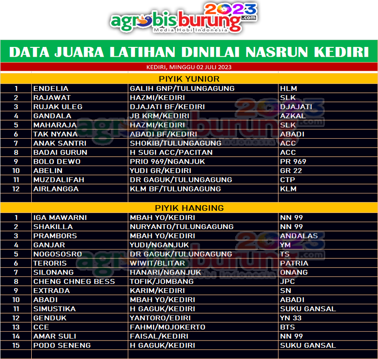 Di kelas piyik hanging, dua jawara bergelang NN 99 menjadi yang terbaik di dua besar jawara Iga Mawarni bergelang NN 999 milik Mbah Yo Kediri menjadi yang terbaik dipodium pertama. Disusul Shakilla bergelang NN 99 dipodium kedua dan Prambors bergelang ANdalas dipodium ketiga.