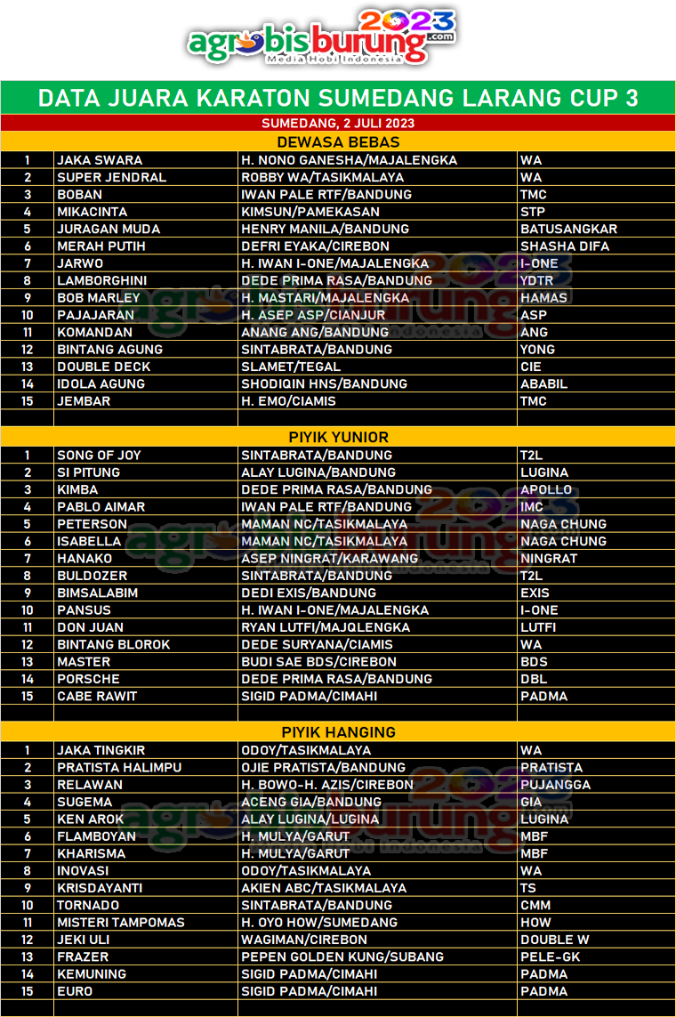 Event kali ini tak berlebihan jika disebut “Tasik Day” (Harinya Tasikmalaya). Ya, karena juara 1 disemua kelas diisi produk Tasikmalaya. Juara 1 kelas dewasa bebas adalah Jaka Swara bergelang WA milik H. Nono Ganesha Majalengka. Kemudian juara 1 piyik yunior ditempati Song Of Joy yang bergelang T2L milik Sintabrata Bintang Agung Bandung. Sedangkan juara 1 piyik hanging ditempati Jaka Tingkir ring WA milik Odoy Tasikmalaya.