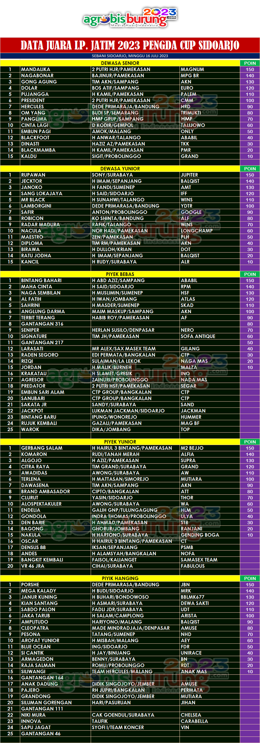Di kelas piyik yunior, debutan muda Gerbang Salam bergelang M2 Bejjo memantapkan posisinya merebut pdoium pertama setelah mampu meredam perlawanan dua seterunya Komaron bergelang Alfia dan Algojo bergelang Supra yang harus puas diposisi kedua dan ketiga. Dan di kelas piyik hanging, jawara belia Porche bergelang JBN memenangi pertarungan panas diblok tersebut, jawara gress tim Primarasa Bandung mampu mengoptimalkan kehebatan Proche untuk merebut podium pertama.  AB-END