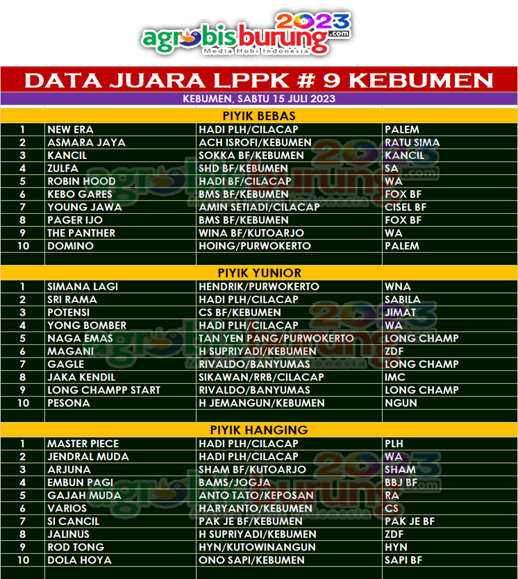 Sementara itu gelaran yang memainkan 3 blok penuh full blok di semua kelas menjadi ajang berburu poin liga yang memang menjadi salah satu daya tarik LPPK tersebut selalu meraiah, di piyik bebas, jawara New Era bergelang Palem milik Hadi PLH masih tegap merebut dipodium pertama. Dan di kelas piyik yunior, jawara terbaik pertamanya diraih Simana Lagi bergelang WNA milik Hendri Purwokerto, di kelas piyik hanging debutan belia yang memang memiliki kemampuan bertarung fightnya seperti Master Piece bergelang PLH milik Hadi PLH Cilacap merebut posisi pertama. AB-ISO/end