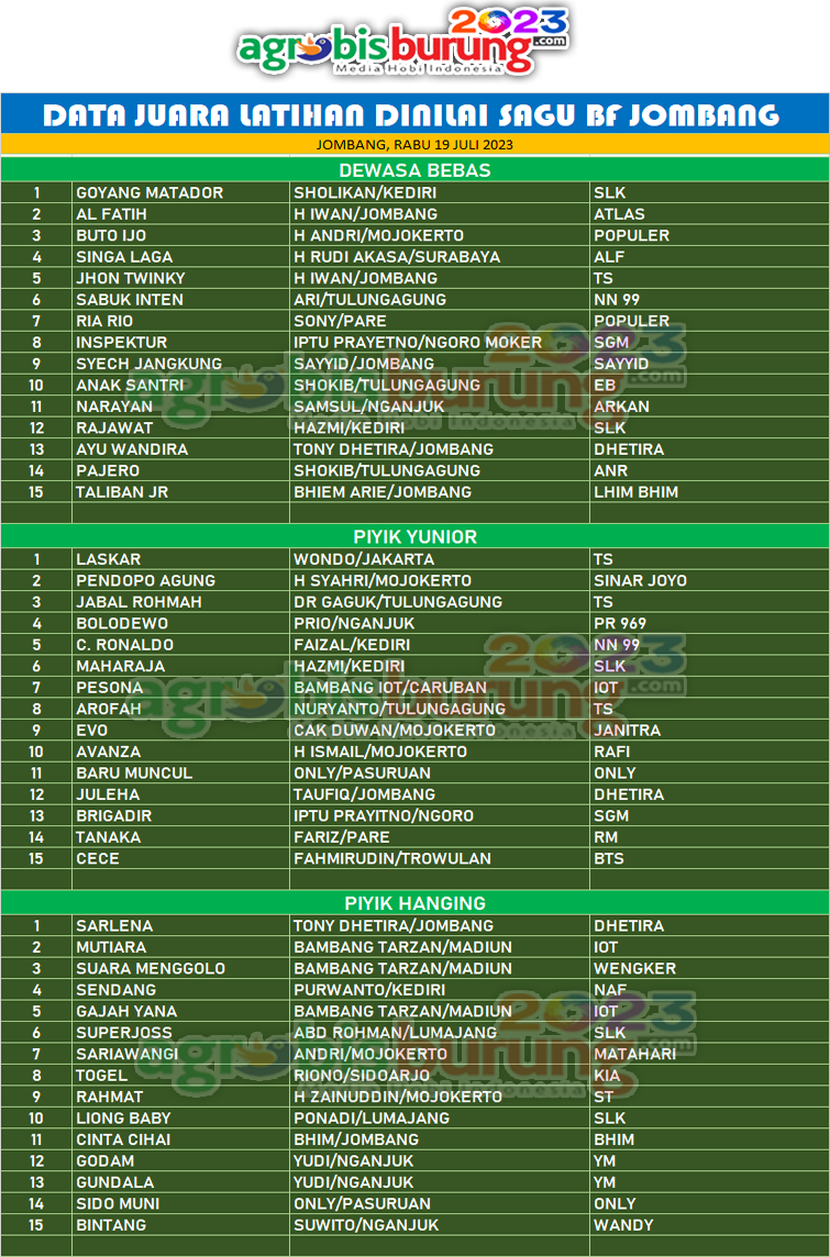 Dan dikelas piyik hanging, jawara belia Sarlena bergelang Dhetira milik Tony Dhetira Jombang menjadi bintang lapangan di kelasnya dengan tampilan terbaiknya untuk merebut podium pertama. Jawara lainnya seperti Mutiara dan Suara Menggolo merebut podium kedua dan ketiga. AB-END