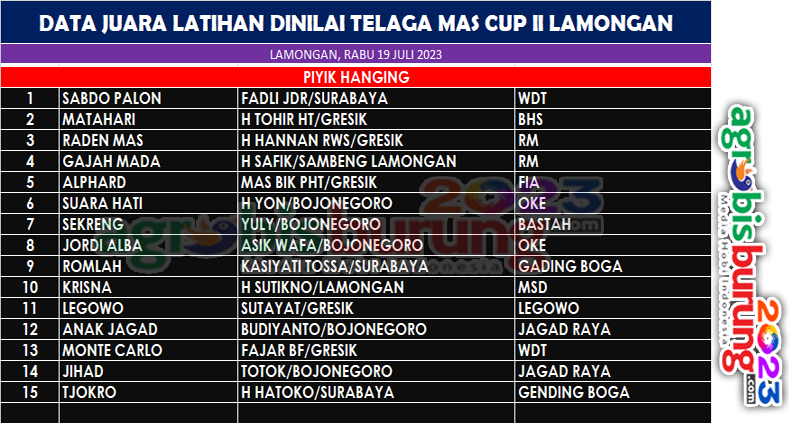 Sementara jalannya latihan dinilai yang hanya memainkan kelas piyik hanging tidak mengurangi serunya pertarungan di tiga besar, jawara Sabdo Palong bergelang WDT milik Fadli JDR Surabaya yang sejak awal babak sudah ngejoss penampilannya benar benar sulit dibendung. Matahari bergelang BHS dan Raden Mas bergelang RM yang terus menguntitnya harus menyerah berada diposisi kedua dan ketiga, Sabdo Palon melejit diposisi pertama. AB-END