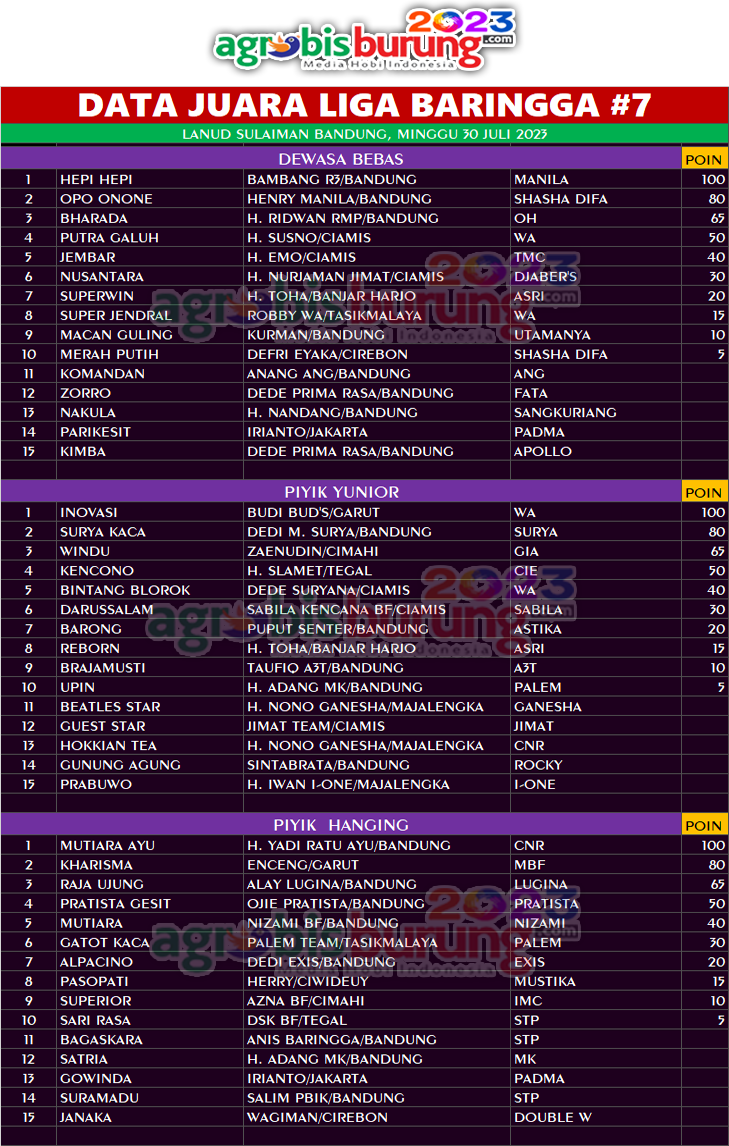 Dengan hasil ini, Hepi-Hepi kini meraih posisi pertama kelas dewasa bebas di klasemen sementara Liga Baringga. Hepi-Hepi total poin 285 berhasil mengkudeta posisi President (Lapindo) milik HSF Team Pamekasan (280) yang merajai selama enam putaran. Dengan selisih poin hanya 5 saja. Sedangkan posisi ketiga ditempati Bharada 265). Sementara posisi puncak klasemen sementara di kelas piyik yunior ditempati Sie Peng An Banyumas (380) diikuti Dede Prima Rasa Bandung (340). Sedangkan kelas piyik hanging dipuncaki Budi Bud’s Garut (320). AB-AMA/END