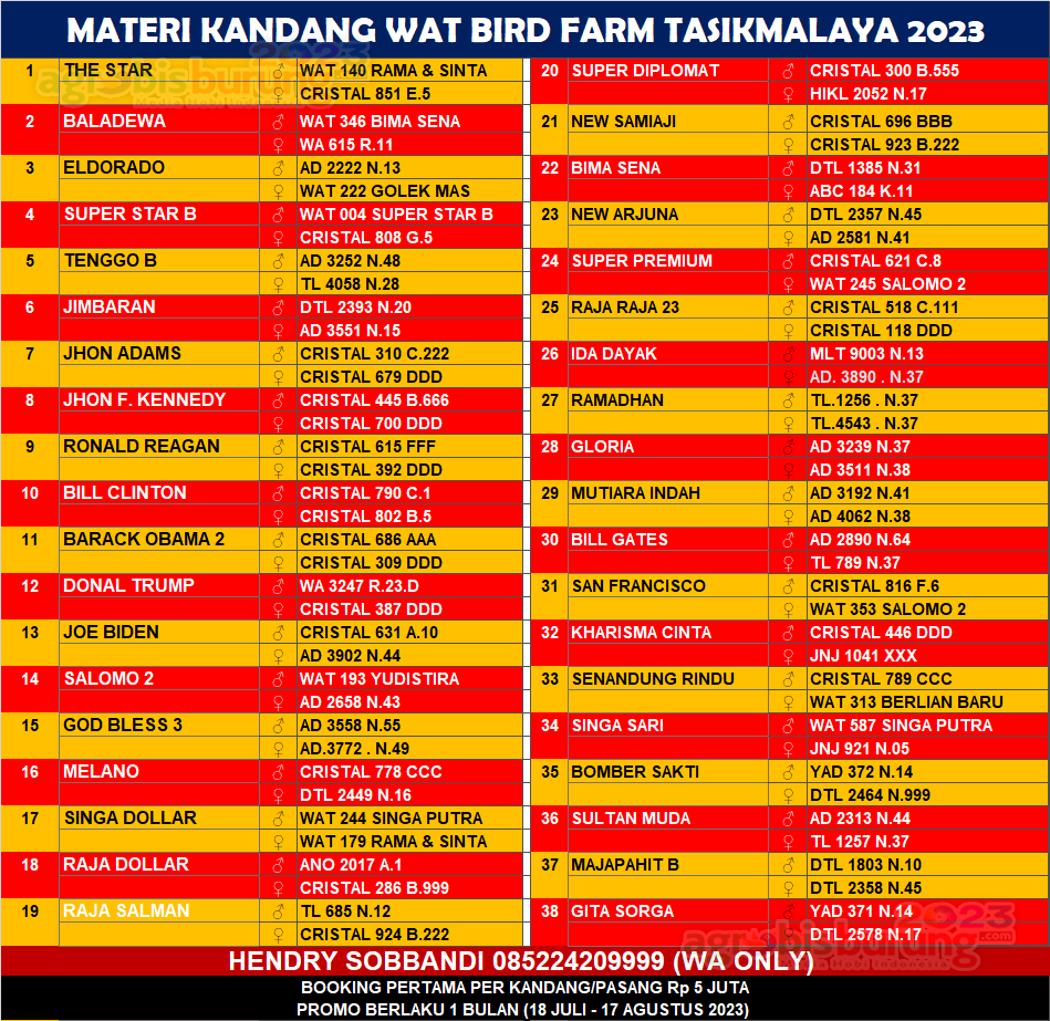 Hendry menambahkan, betina Cristal Triple D dipasangkan dengan para jantan istimewa pula. Pilihan terbaik dengan trah juara. Di kandang 7. Jhon Adams, dipasangkan dengan jantan Cristal 310 C.222. Kemudian, di kandang 8. Jhon F. Kennedy (Cristal 445 B.666), kandang 9. Ronald Reagan (Cristal 615 FFF), kandang 11. Barack Obama 2 (Ceistal 686 AAA), kandang 12. Donald Trump (WA R 23 D), dan kandang 25. Raja Raja 23 (Cristal 518 C.111). Ibarat seorang koki, lain tangan lain masakan. “Walaupun resepnya sama. Semoga WAT bisa diobrak oplosannya,” harapnya.