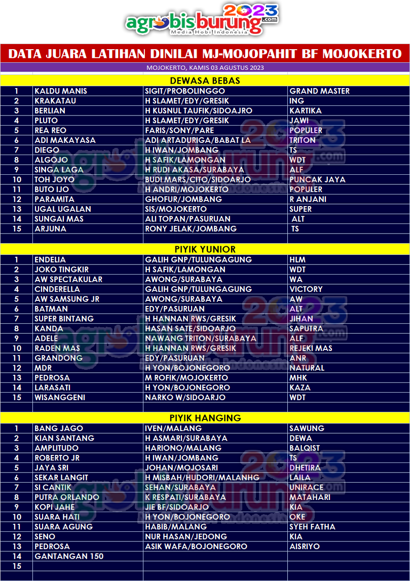 MOJOKERTO, agrobisburung.com – Latihan dinilai rutin Kamisan di lapangan MJ Mojopahit BF Mojokerto pada Kamis (03/08) berjalan sangat meriah, kungmania dari berbagai kota beramai ramai hadir di gelaran yang dijadikan “pemanasan” jelas LP Jatim di Pamekasan akhir pekan ini. Dan hasilnya banyak debutan debutan baru yang justru menguasai podium utamanya. H Andri, tuan rumah mengatakan agenda hari ini memang tetap antusias pelaksanaan dan pesertanya, selalu full blok untuk semua kelas yang dibuka panitia dan pastinya ini menunjukkan hobi perkutut benar benar sangat meriah di pertengahan tahun 2023 ini. “Dan isnyaallah kita akan gelara LP Jatim di Mojokerto akan memakai lapangan MJ Mojopahit ini, saya akan memenuhi standar lapangan untuk gelaran liga Perkutut Jawa Timur. Juga banyak kungmania yang setuju gelaran tersebut bisa di laksanakan di sini,”ucap H Andri pada agrobisburung.com .