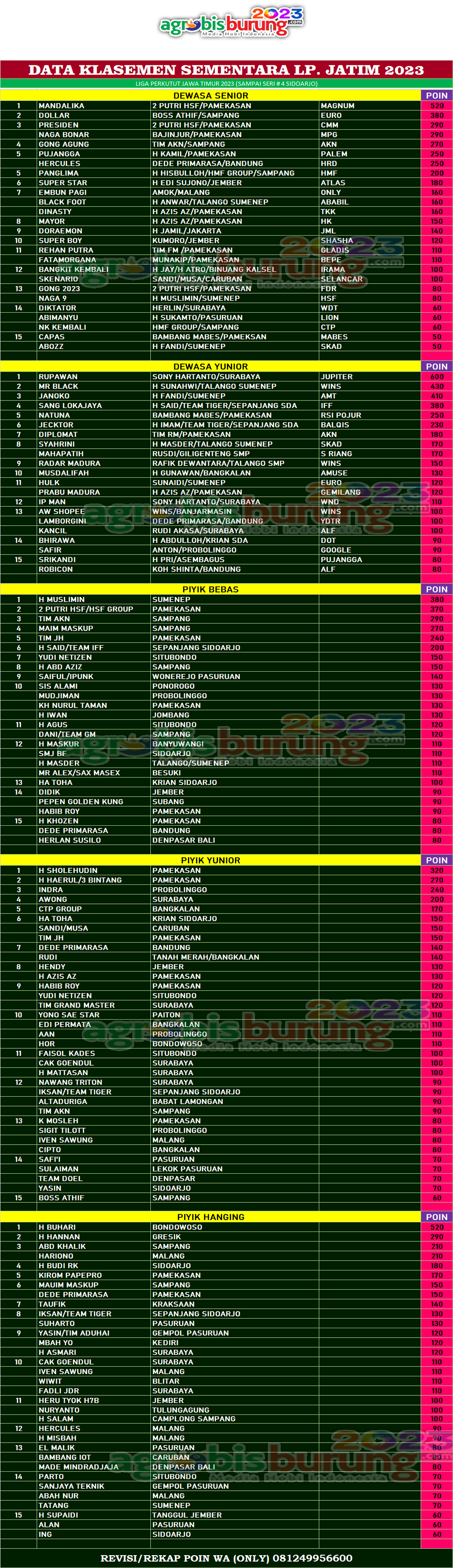 Sementara di kelas Dewasa yunior, jawara Rupawan bergelang Jupiter milik Sony Hartanto menjadi terbaik pertama di kelasnya dan di kelas hanging nama H Buhari Bondowoso menguasai podium pertama klasemen sementara. AB-END