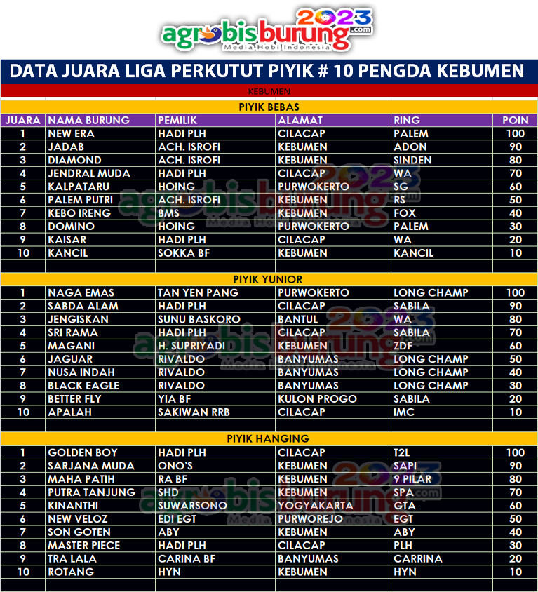 Dari hasil 10 putaran yang sudah bergulir sejak 2022 lalu para pemuncak klasemennya direbut Moh Isrofi Kebumen di kelas piyik bebas dan Hadi PLH Cilacap langsung mengunci dua kelas dengan posisi hebatnya di kelas piyik yunior & hanging yang sama sama merebut posisi pertama. AB-OFI/end