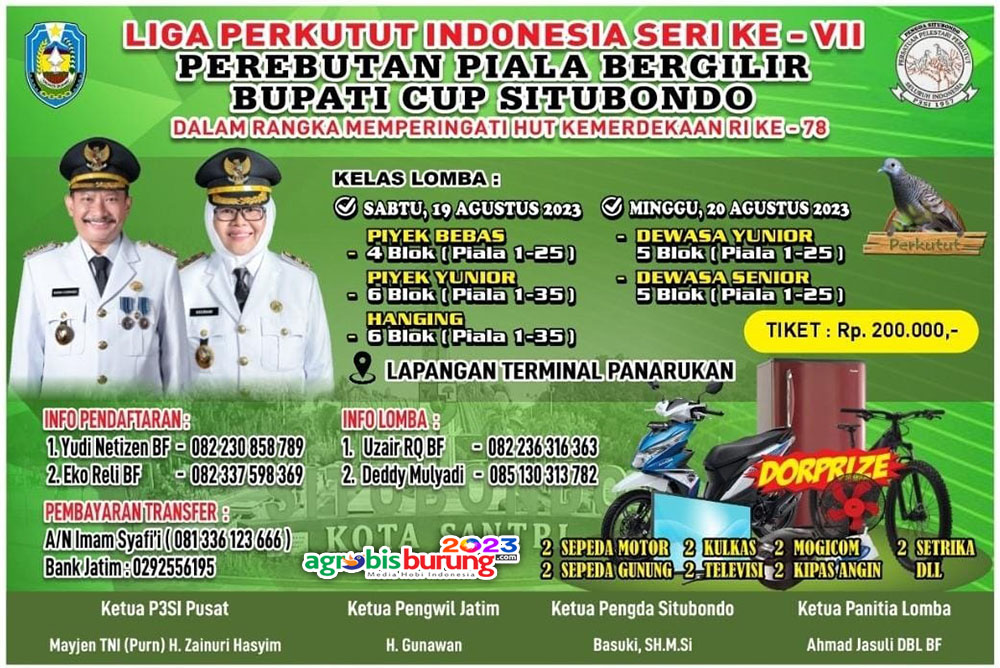 SITUBONDO, agrobisburung.com – Akhir pekan ini konsetrasi kungmania Indonesia akan bergeser ke daerah “tapal kuda” Situbondo pada Sabtu-Minggu (19-20/08) tepatnya gelaran yang berlokasi di Terminal Panarukan sekaligus memperebutkan piala Bupati  Situbondo serta untuk memperingati HUT RI ke-78 tahun 2023. Ahmad Jasuli  DBL, ketua panitia gelaran LPI mengatakan bahwa sejarah akan diciptakan di Situbondo yang mampu menjadi tuan rumah gelaran nasional konkurs perkutut. Dimana nantinya burung perkutut terbaik di Indonesia akan hadir dan melakoni mandatory fight “wajib tarung” di LPI  # 7 Situbonodo dan tentunya persiapan selama dua bulan terakhir yang di dukung Bupati Situbondo akan kita wujudkan dengan gelaran yang istimewa di salah satu daerah perkembangan hobi perkutut di blok timur jatim. “Selamat datang kepada kungmania Indonesia di Situbondo, mari kita ciptakan suasana lomba yang fair play untuk ikut menyemarakkan HUT RI ke-78 dengan kegiatan lomba burung perkutut, merdeka … ” ucap Jasuli DBL pada agrobisburung.com