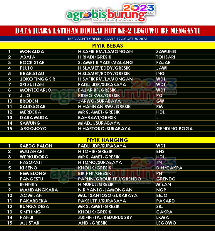 Sementara itu jalannya latihan menampilkan jawara jawara brilian yang menampilkan kehebatannya di masing masing kelas, di piyik bebas jawara Monalisa bergelang Sawung milik H Safik RM Lamongan yang memang sudah ngejoss sejak awal babak tampil the best dan mampu menuntaskan pertarungannya untuk merebut posisi pertama. Disusul Abata bergelang Tohsari dan Rock Star bergelang Fajar yang menempati posisi kedua dan ketiga.