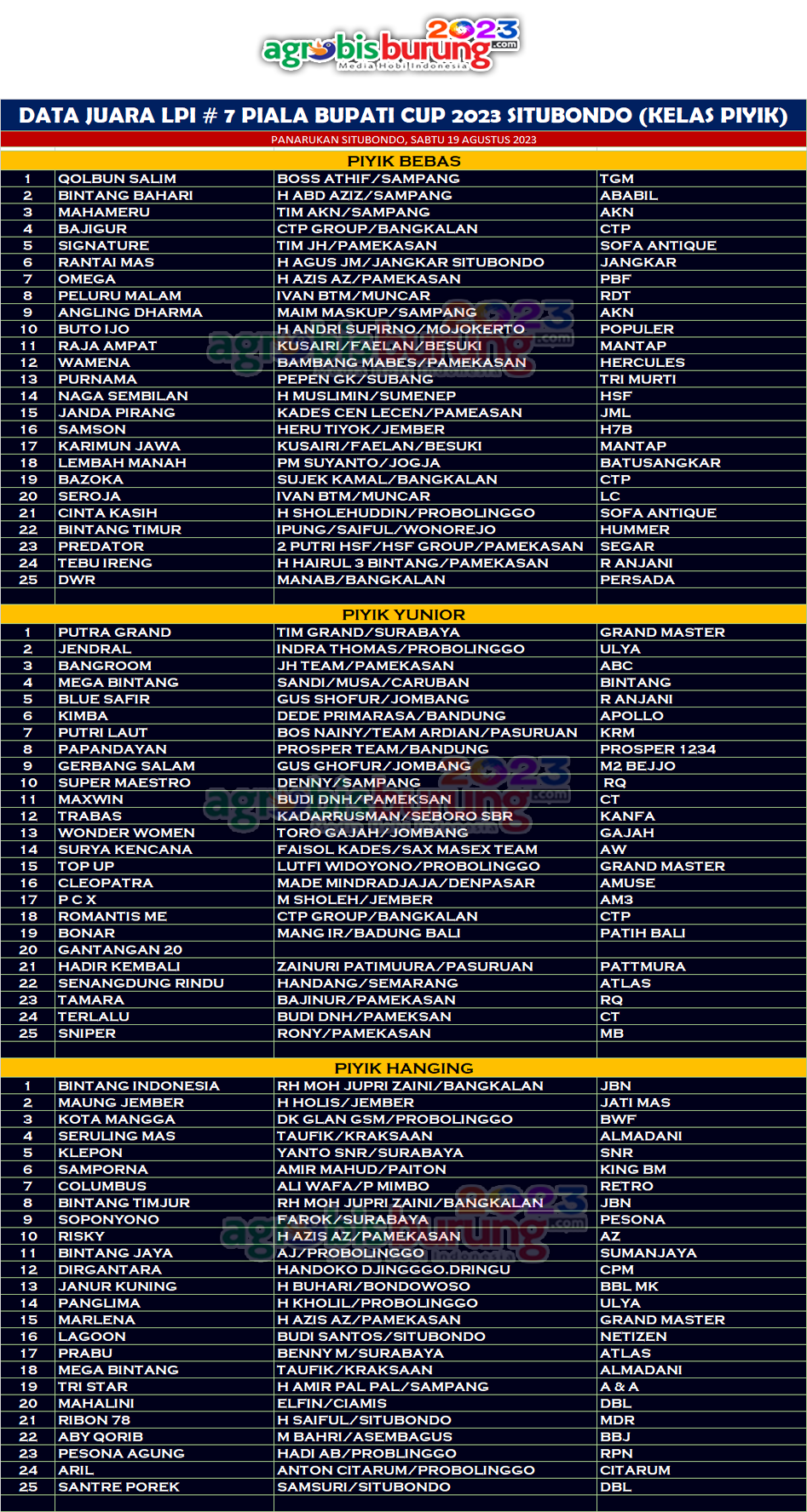 Data Juara LPI # 7 Piala Bupati Situbondo Cup 2023, Sabtu 19 Agutus (Kelas Piyik)