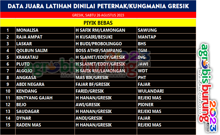 Sementara itu jalannya latihan dinilai kali ini menjadi milik Monalisa jawara bergelang Sawung milik H Safik Lamongan menjadi pemikat pertama di podium pertama setelah dengan mudah mengeser posisi lawan lawannya. Raja Ampat bergelang Mantap dan Laskar bereglang BHS yang juga tampil apik harus mengakui kehebatan Monalisa dan harus puas berada di posisi kedua dan ketiga. AB-END