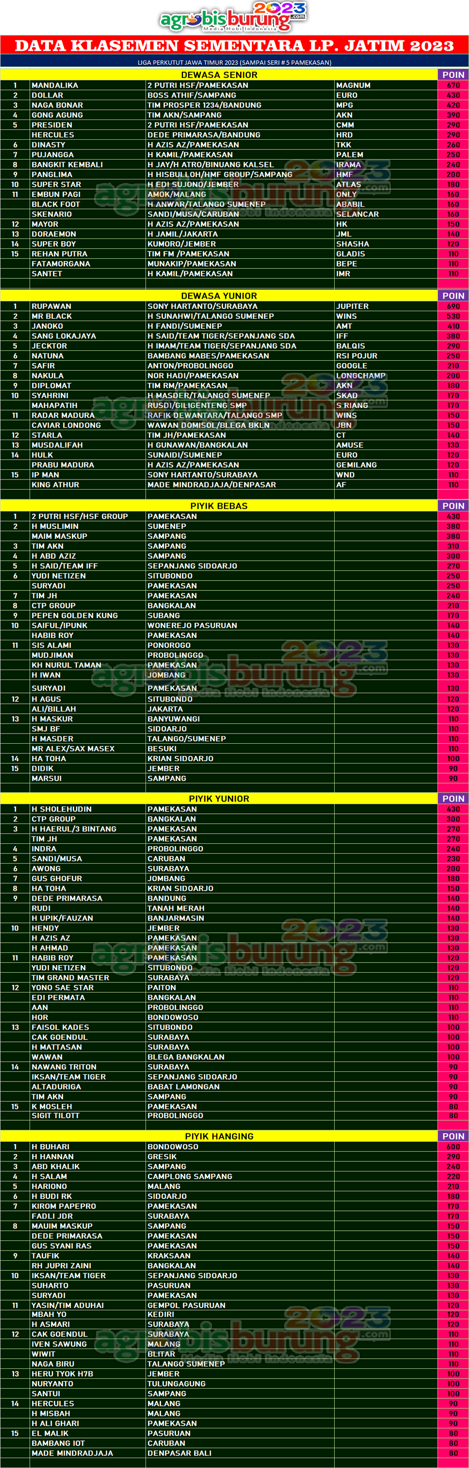 Pergeseran posisi terbaik pertama hanya terjadi di kelas piyik bebas setelah hasil LP Jatim Bawang Mas Group Cup Pamekasan, H Muslimin (380) & Maim Maskup (380) yang sempat berada di posisi pertama harus tergeser oleh perolehan poin 2 Putri HSF (430) . Di kelas piyik yuniornama H SHolehudin Pamekasan (430) dan kelas piyik hanging nama H Buhari Bondowoso (600) masih kokoh diposisi pertama klasemen sementara LP Jatim 2023.