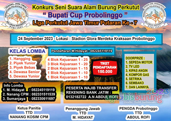 PROBOLINGGO, agrobisburung.com – Penghuni klasemen sementara LPI 2023 tampaknya semakin jelas, sampai hasil seri LP. Jatim #6 di Mojokerto para pemburu poin semakin memantapkan posisinya serta pergeserang di papan tengah juga terlihat mulai berganti ganti posisi. Dan tentunya perburuan poin akan semakin seru di LP Jatim Bupati Cup Probolinggo yang akan di gelar pada Minggu 24 September di Stadion Glora Merdeka Kraksaan Probolinggo serta jago jago terbaik di Jawa timur juga akan hadir untuk meramaikan gelaran tersebut yang sudah masuk agenda konkur LP Jatim 2023. Nanang CPM, panitia sekaligus mewakili kru panitia mengatakan bahwa persiapan konkurs LP Jatim Bupati Cup Probolinggo sudah siap dilaknsakan dan panitia menyampaikan selamat datang kungmania Jawa Timur untuk meramaikan agenda LP Jatim 2023 di Kraksaan Probolinggo (24/09).