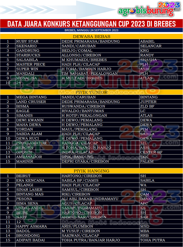 Headline Hobi Burung Juara Organizer Perkutut Perkutut Profil Tokoh Data Juara Konkurs Ketanggungan Cup 2023 di Brebes, Minggu 24 September agrobisburung 24 September 2023 BREBES, agrobisburung.com – Data Juara Konkurs Ketanggungan Cup 2023 di Brebes, Minggu 24 September Tinggalkan Komentar Post navigation Previous: Data Juara LP. Jatim # 7 Bupati Cup 2023 Probolinggo, Minggu 24 SeptemberNext: Kharisma,Bujang Tangsel Heroik & Jawara Ababil Dua Libas Lawan Lawannya di Liga Batavia #5/IV Nusa Cup # 3 Bogor More Stories Headline Perkutut Profil Nunu Depok “Turun Gunung” Langsung Borong 5 Pasang K-Unggulan WAT BF Tasikmalaya, H. Pendi Nadira Jakarta Jebol K-WAT Brahmana & BDB BF Lombok Jebol K-WAT Raja Ampat agrobisburung 13 Januari 2026 Headline Juara Perkutut Jawara Bandar Jawa 1, Boxer & Joko Tarub Melejit ke Podium Utama Di Latihan Dinilai Pengcam Pengantenan Pamekasan agrobisburung 12 Januari 2026 Headline Juara Perkutut Jawara Gading Asmara & Cah Samin Berkuasa Dikelasnya di Latihan Dinila Pengda Bojonegoro agrobisburung 11 Januari 2026