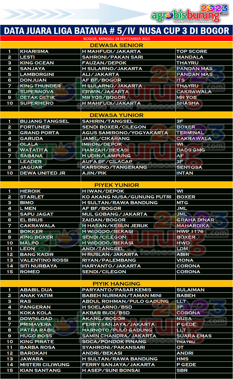 BOGOR, agrobisburung.com – Lanjutan seri Liga Batavia 2023 # 5/IV berlabel Nusa Cup 3 kembali digelar di Lapangan Nusa BF Gunung Putri Bogor pada Minggu (24/09) yang memainkan 4 kelas sekaligus yaitu dewasa yunior (1 blok) & Senior (1 blok) serta kelas piyik yunior dan kelas piyik hanging.  Cuaca cerah dan suasana yang meriah membuat jalannya liga sangat asyik dan bersemangat, terlihat para pemilik jawara ataupun joki sangat antusias untuk mengawal jago jago terbaiknya tampil merebut juara. Di kelas dewasa senior, Kharisma bergelang Top Score milik H Mahfudi  Jakarta yang memang sudah dipersiapkan tampil optimal bisa membuktikan dirinya yang terbaik di kelasnya, Kharisma mampu merebut podium pertama disusul Lesti bergelang Mandala di posisi kedua dan King Ocean di posisi ketiga.