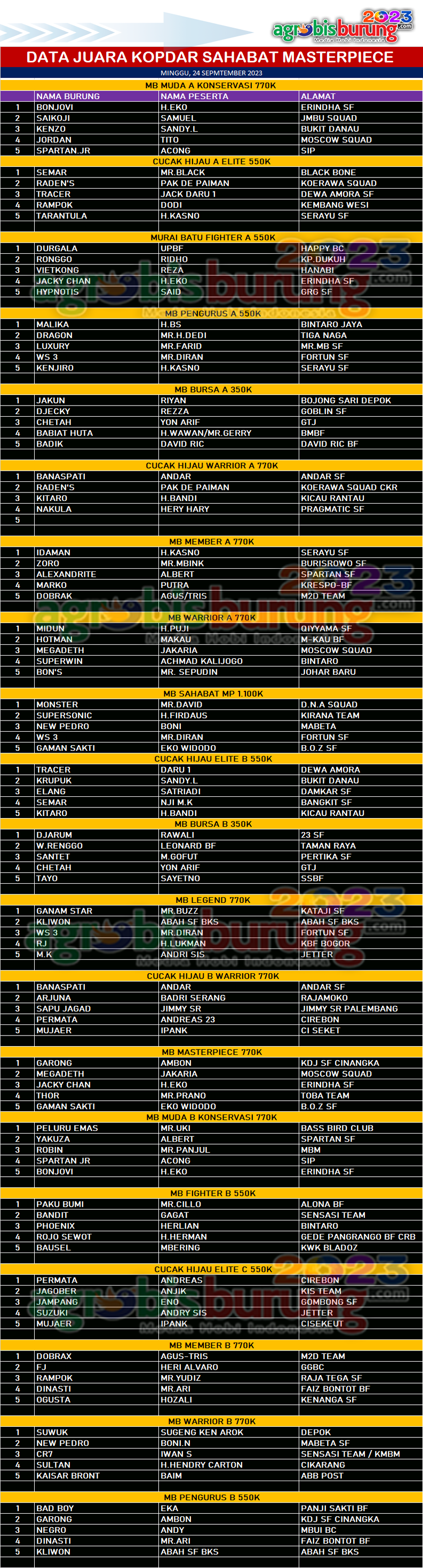 Headline Hobi Burung Juara Organizer Perkutut Perkutut Profil Tokoh Data Juara Kopdar Sahabat Masterpiece di BSD Tangerang, Minggu 24 September agrobisburung 25 September 2023 BSD TANGERANG, agrobisburung.com – Data Juara Kopdar Sahabat Masterpiece di BSD Tangerang, Minggu 24 September Tinggalkan Komentar Post navigation Previous: WAT BF Tasikmalaya Pernah Lahirkan Meteor Selancar, Salah Satu Legenda Jawara LPI Awal 2000-an yang Dibandrol 1,5 MNext: Aksi MB Jacky Chan, Monster Jadi Salah Satu Pertarungan seru di Kopdar Sahabat Masterpiece Arena BSD Tangerang More Stories Headline Perkutut Profil Jawara “Larisa” Produk Terbaik Andhi GKR Siwi Semarang Di Take Over Primarasa Team Bandung, Dealnya Istimewa agrobisburung 2 Maret 2026 Headline Juara Perkutut Ngabuburit Meriah bersama Pengda Sleman, Tim Chelsea & Goendul Hampir cetak Hattrik, Jawara Puji & Have Fun Go Mad Melejit di Ramadhan Cup 2026 DIY agrobisburung 2 Maret 2026 Headline Juara Perkutut Pesertanya Fullblok, Jawara Kumara & Purbaya Tampil Penuh Aksi Di Latihan Dinilai Ramadhan Cup 2026 Pengcam Tembalang Semarang agrobisburung 1 Maret 2026