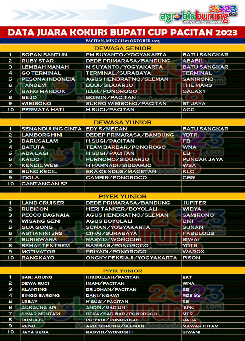 Di dua kelas piyik yunior dan piyik hanging masing masing yang menempati podium pertama adalah Land Cruiser begelang Jupiter milik Dede Primarasa, kemenangan jawara milik Tim Primarasa yang turun full team benar benar menunjukkan eksistensinya di lapangan. Dan di kelas piyik hangin yang menjadi terbaik adalah Sari Agung bergelang EKT milik Hisbullah Pacitan. AB-END
