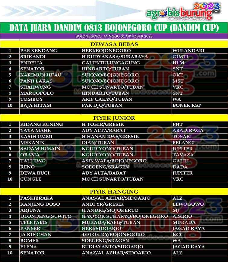 Di kelas piyik yunior, debutan muda Kidang Kuning bergelang PHT milik H Tohir PHT Gresik tampaknya mulai menujukkan taring tajamnya di lomba, setelah terpantau jawara ini langsung masuk dalam training lomba dan hasilnya melejit di Bojonegoro. Diposisi kedua dan ketiga kelas tersebut direbut Yaya Mahe bergelang Abadiraga dan Kasih Ummi bergelang Tohsari.