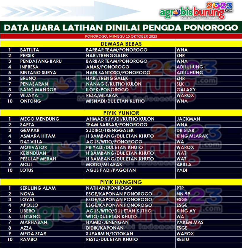 Di kelas piyik yunior, jawara Mego Mendung bergelang Jackman milik Ahmad Suyudi dari Kutho Kulon Ponorogo menjadi yang terbaik di kelasnya setelah merebut podium pertama dari lawan lawan tangguhnya. Dan di kelas piyik hanging yang menjadi terbaik pertama direbut oleh Seruling Alam bergelang PTP milik Nathan dari Ponorogo yang benar benar mendominasi jalannya pertarungan di kelas tersebut. AB-EGE/END