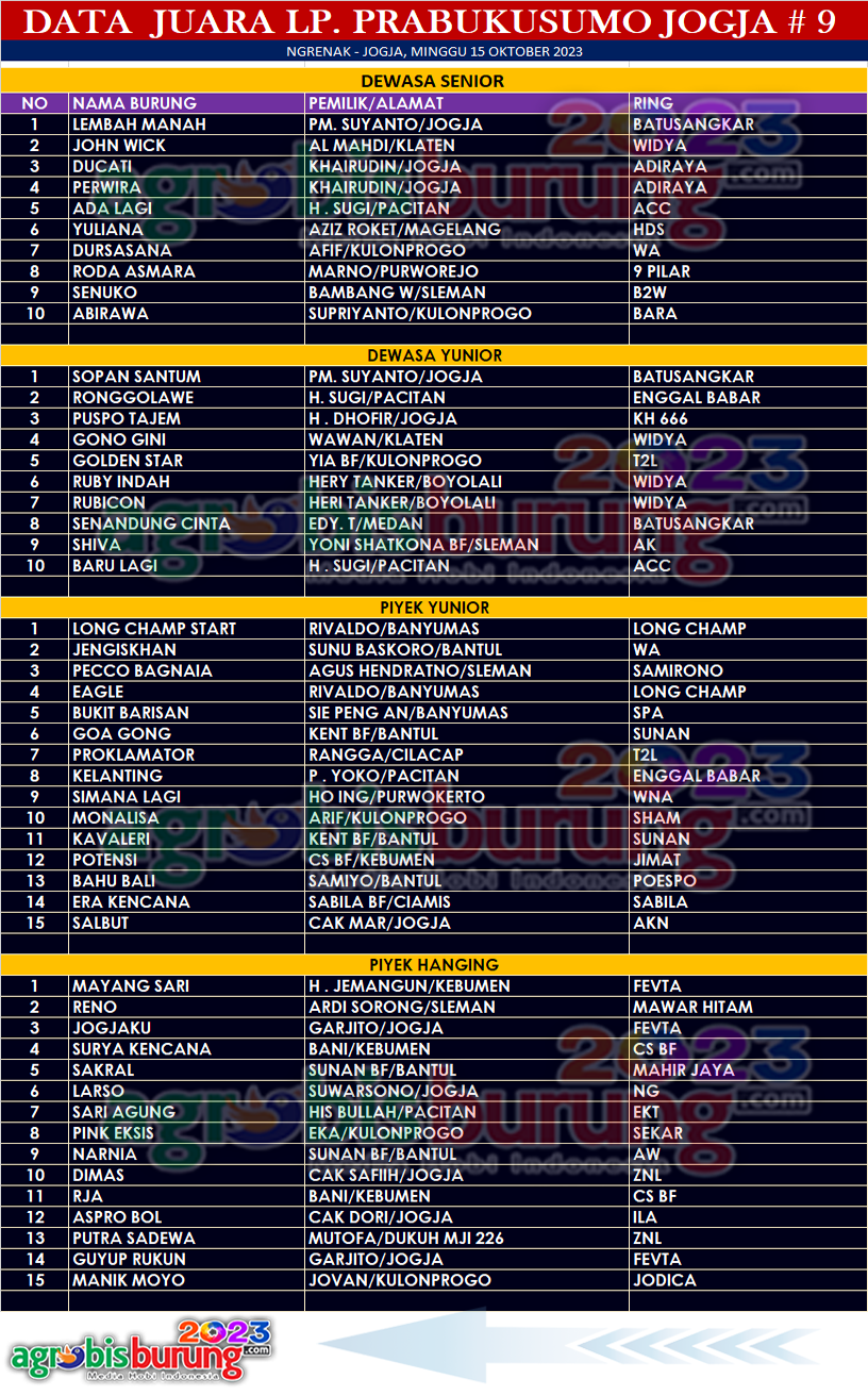 JOGJA, agrobisburung.com – Gelaran lanjutan seri LPPJ putaran ke 9 yang digelar Minggu (15/10) di Lapangan Ngrenak, Godean, Sleman Jogja berjalan cukup sukses. Meskipun ada beberapa gantangan yang terlihat kosong, namun itu tidak mengurangi kemeriahan gelaran tersebut. Banyak jagoan -jagoan yang tampil “fight’ menunjukkan performa terbaiknya.