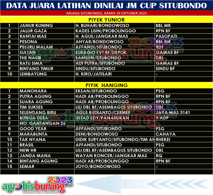 Dan di kelas piyik hanging, debutan belia Manohara bergelang PSG milik Eksan Situbondo memenangkan persaiangan tersebut dan mampu menorehkan poin tertinggi untuk merebut posisi pertama. Posisi keduadan ketiga direbut duet jawara milik Hadi AB Probolinggo yaitu jawara Putra Agung dan posisi ketiga direbut Suara Agung. AB-END