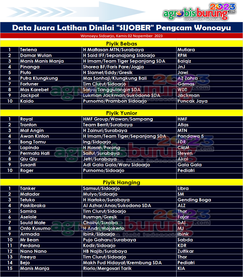 Dan di kelas piyik hanging debutan belia Tanker bergelang Libra milik Samsul Sidoarjo tampil mengesankan untuk merebut posisi pertama setelah dengan gagahnya bisa unggul atas Matador bergelang SM dan Tetuko bergelang Gending Boga yang harus puas di posisi kedua dan ketiga. AB-END