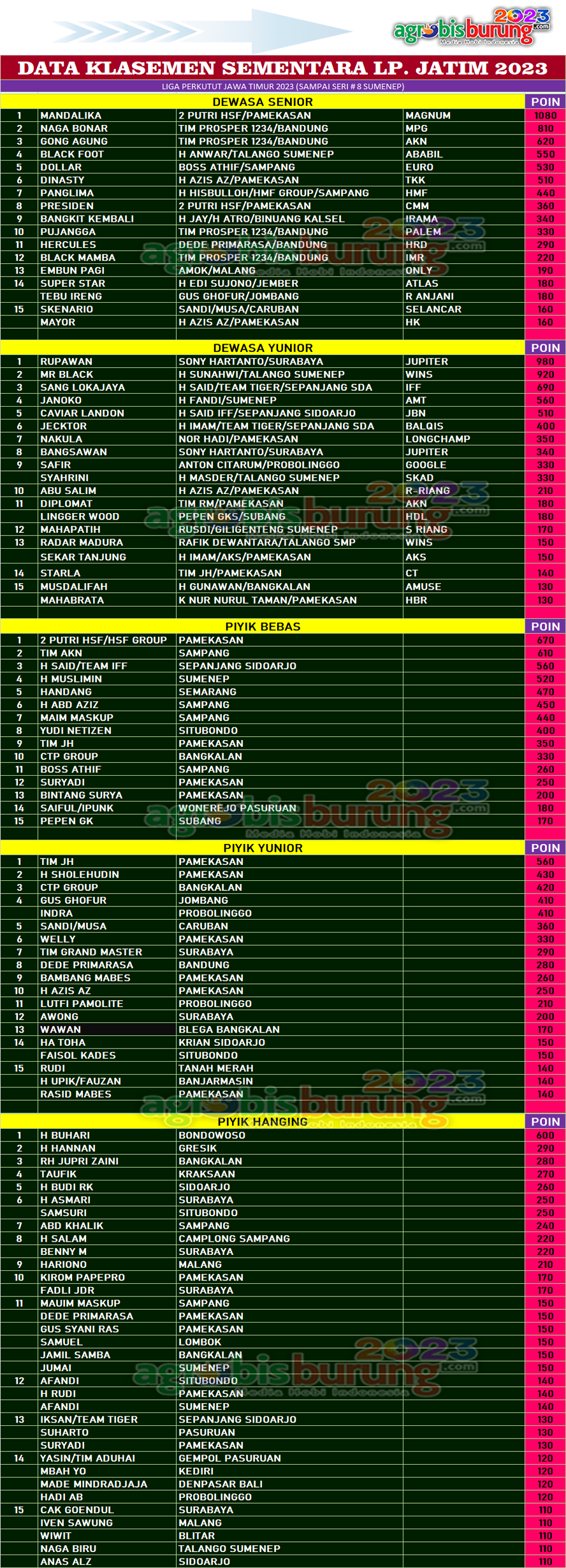 PASURUAN, agrobisburung.com – Di gelaran LP. Jatim # 9 di Tegalan Poh Cup 2023 pada Sabtu (04/11) perburuan poin dan perebutan posisi tiga besar di semua kelas LP Jatim bakal seru pergeserannya. Di dewasa senior Mandalika memang masih kokoh di posisi pertama namun duet jawara milik Tim Prosper 1234 Naga Bonar dan Gong Agung tampaknya mengejot lajunya untuk bisa optimal di akhir seri LP Jatim 2023.