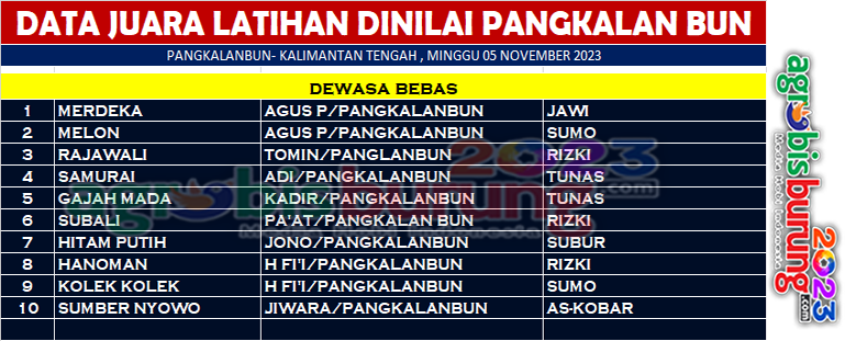 Sementara itu jalannya latihan dinilai kali ini jawara Merdeka bergelang Jawi dan Melon bergelang Sumo yang sama sama milik Agus mampu bertahan diposisi satu dan dua, disusul Rajawali bergelang Rizki diposisi ketiga. Ketiganya ngorbit dan mampu tampil mempesona untuk berebut di tiga besar kelas dewasa bebas yang dimainkan panitia. AB-END