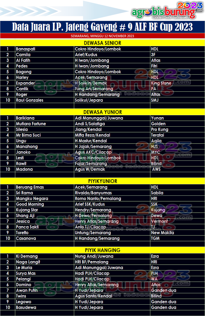 Di kelas piyik yunior dan piyik hanging yang menempati posisi terbaik pertama adalah Beruang Emas bergelang HDL milik Acek Semarang mampu menjadi bintang lapangan dengan raihan nilai tertinggi untuk menempati tahta pertama di kelas piyik yunior. Dan di kelas piyik hanging jawara belia bernama Ki Demang bergelang Ezra milik Nung Andi Juwana juga bikin kejutan di kelasnya dengan mengungguli lawan lawan tangguhnya untuk melejit di posisi pertama. AB-END