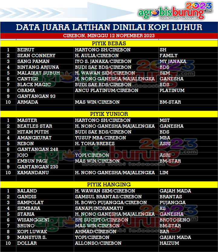 Di kelas piyik yunior, Hartono SH berhasil menempatkan andalan anyarnya, Master bergelang MST BF Blitar. Pekan lalu, Master meraih juara kedua dikelas yang sama pada gelaran bergengsi LPJJB #4 Galunggung Cup Tasikmalaya (5/11/23). Kali ini, Master menyisihkan Beatles Star (Ganesha) andalan H. Nono Ganesha Majalengka dan Hitam Putih (BDS) debutan Budi Sae BDS Cirebon. Sementara di kelas piyik hanging, Baland (Gajah Mada) milik H. Wawan Cirebon memgungguli Gandis (Brantas) milik Samsul Cirebon dan Sampolay (Pujangga) milik H. Bowo Pujangga Cirebon. “Ladini ini mengisi kekosongan jadwal. Kungmania Cirebon selalu antusias jika digelar ladini. Bahkan tiga kelas pesertanya selalu full,” ujar Sunardi, ketua P3SI Pengda Cirebon, yang aktif menggerakan kegiatan di wilayah Cirebon. AB-AMA/End