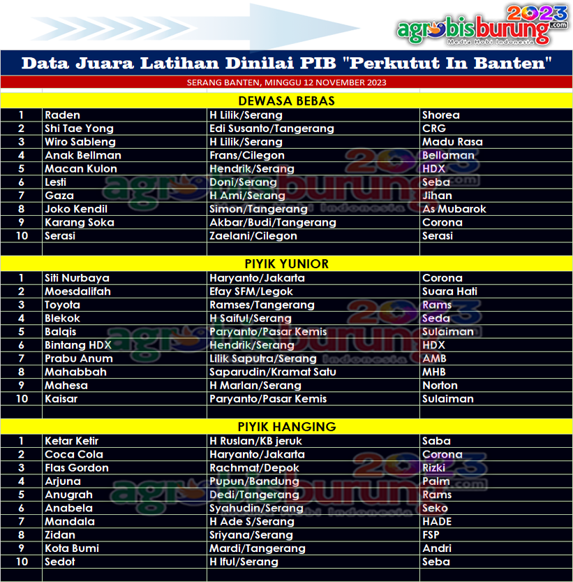 Dan di kelas piyik yunior juara terbaiknya direbut Siti Nurbaya bergelang Corona milik Haryanto Jakarta yang tampil memukau untuk merebut podium pertama. Sementara dikelas piyik hanging yang menjadi juara pertamanya direbut jawara belia Ketar Ketir bergelang Saba. AB-END