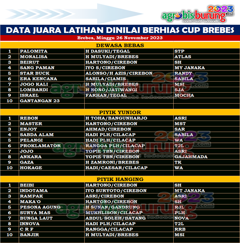 Di kelas piyik yunior, debutan muda Reborn bergelang Asri milik H toha Bangun Harjo menguasai podium bertama dan di kelas piyik hanging yang menjadi terbaik pertama adalah jawara Beibi bergelang SH milik Hartono Cirebon. AB-OVA/END