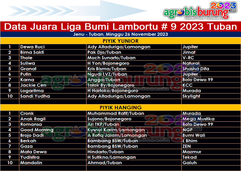 Sementara jalannya latihan di nilai dimasing masing kelas menampilkan burung burung terbaik, di piyik yunior debutan mudaDewa ruci bergelang Jupiter milik Ady Altaduriga Lamongan menjadi yang terbaik pertama di kelasnya. Disusul Bima Sakti bergelang Jimat dan Thole bergelang V-RC diposisi kedua dan ketiga. Dan yang terbaik di kelas piyik hanging kali ini direbut Cronk bergelang Murada milik Muhammad Rafit asal Tuban dan kemenangan Cronk tentu membanggakan bagi Murada BF yang asli Tuban. “Alhamdulillah semuanya berjalan dengan baik dan produk Murada juga ikutan tampil di podium pertama, terima kasih kepada Cronk yang sudah berprestasi. AB-END