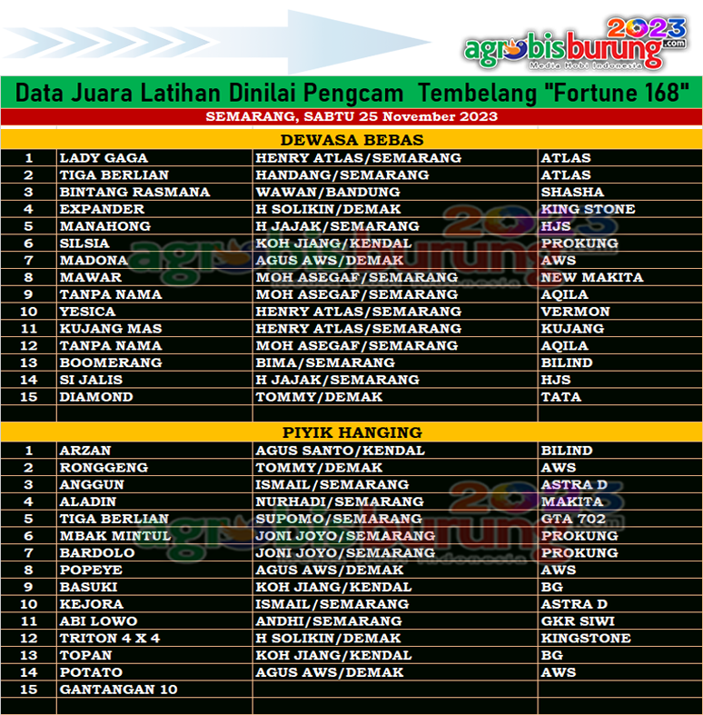 Di dewasa bebas, Lady Gaga bergelang Atlas milik Henry Semarang tampil mengesakan untuk merebut pdoium pertama setelah menang tipis dari Tiga Berlian bergelang atlas dan Bintang Rasmana bergelang Shasha. Sementara di kelas piyik hanging Arzan bergelang Bilind milik Agus  Santo Kendal tampil istimewa di depan lawan lawan tangguhnya dan di babak penentuan merebut posisi pertama. AB-END