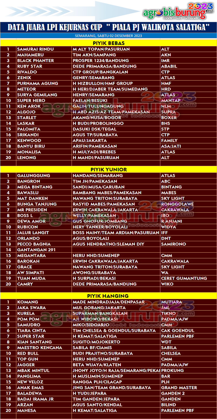 Headline Hobi Burung Juara Organizer Perkutut Perkutut Profil Tokoh Data Juara LPI # 12 Kejurnas Cup “Piala PJ Walikota Salatiga” 2023, Sabtu 02 Desember (Kelas Piyik) agrobisburung 2 Desember 2023 Kru Panitia dan Korps Juri P3SI SALATIGA, agrobisburung.com – Data Juara LPI # 12 Kejurnas Cup “Piala PJ Walikota Salatiga” 2023, Sabtu 02 Desember (Kelas Piyik) Tinggalkan Komentar Post navigation Previous: Beberapa Agenda P3SI & Moment Penting Bakal dilaksanakan, Tersajikan di LPI Kejurnas SalatigaNext: Samurai Rindu, Galunggung & Komang Rebut Podium Pertama di LPI Kejurnas Cup Piala PJ Walikota Salatiga More Stories Headline Juara Perkutut Pesertanya Fullblok, Jawara Kumara & Purbaya Tampil Penuh Aksi Di Latihan Dinilai Ramadhan Cup 2026 Pengcam Tembalang Semarang agrobisburung 1 Maret 2026 Headline Juara Perkutut Tetap Bertoleransi di Latihan Dinilai TS Ramadhan Cup “26 Jombang, Jawara Pancasona & Pariket Melejit Diposisi Pertama agrobisburung 1 Maret 2026 Headline Perkutut Profil Hendry Sobbandi : “Pemula Perkutut Tak Perlu Bingung dalam Memilih Burung Berkualitas, Fokus Saja pada Karakter Suara !” agrobisburung 27 Februari 2026