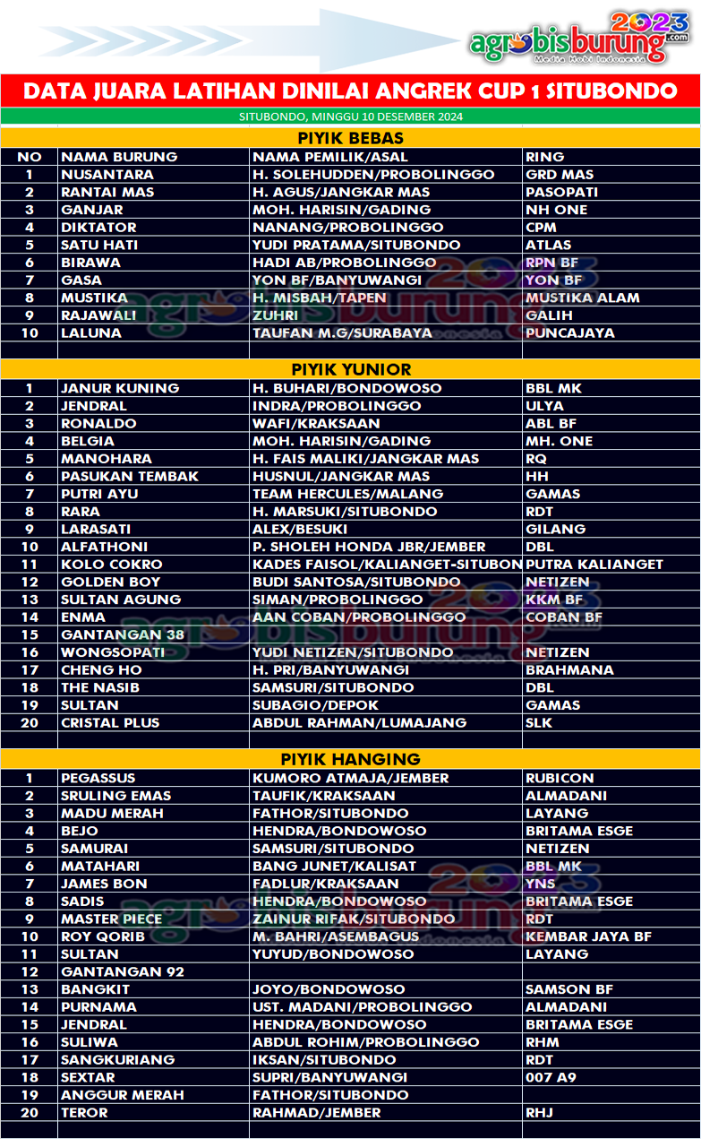 Di kelas piyik yunior, jawara Janur Kuning begrelang BBLMK yang mulai dewasa dinaikkan kelasnya dan jawara milik H Buhori Bondowoso ini tetap sukses merebut posisi pertama. Disusul Jendral bergelang Ulya dan Ronaldo begrelang ABL diposisi kedua dan ketiga. Dan juara di kelas piyik hanging adalah Pegasus bergelang Rubicon milik Kumoro Jember yang ternakannya mulai mencetak burung burung ciamik. AB-END