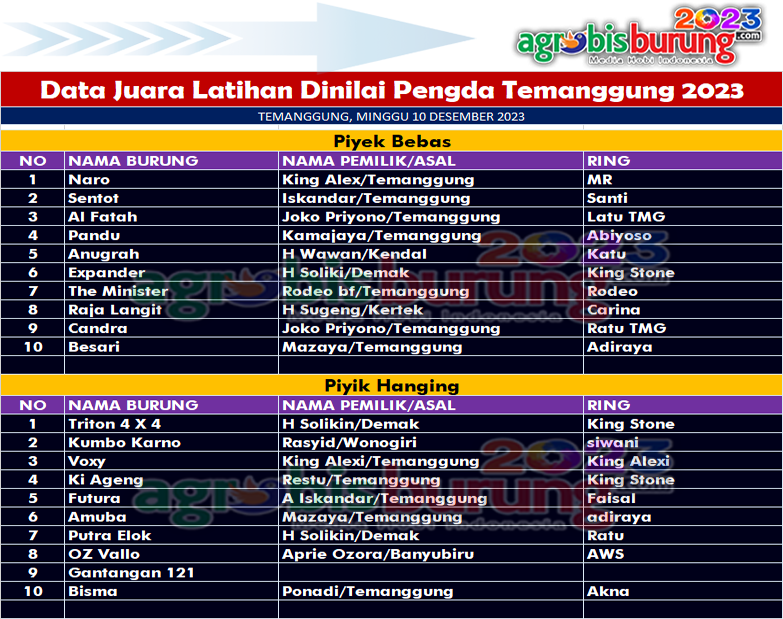Dan di latihan dinilai kali ini dua jawara terbaik di dua kelas yang dimainkan adalah Naro berglang MR milik King Alex Temannggung yang menjadi terbaik di kelas piyik bebas. Dan yang menjadi juara di kelas piyik hanging adalah jawaraTriton 4X 4 milik H SOlikin Demak. AB-END