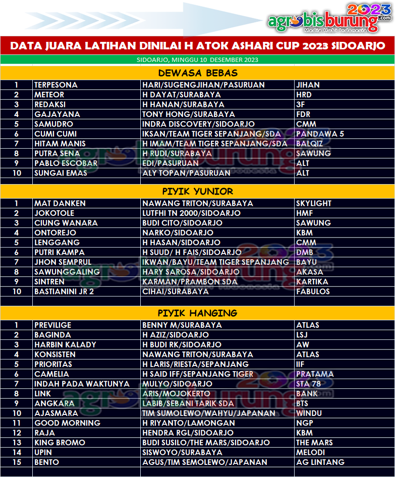 Di kelas piyik hanging jawara belia yang merebut posisi terbaik adalah Previlige bergelang Atlas milik Benny M Surabaya, Privilige sendiri adalah adik jawara Putra Kadur yang di LPI Salatiga tampil istimewa. Diposisi kedua ditempati jawara Baginda bergelang LSJ dan posisi ketiga ditempati Harbin Kalady bergelang AW. AB-END