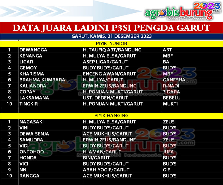Di kelas piyik yunior, Dewangga milik H. Taufiq A3T Bandung, berhasil menguasai persaingan di kelas kerekan setengah tiang. Produk terkini A3T ini mengalahkan pesiang beratnya, Kenanga (MBF) milik H. Mulya Elsa Garut dan Ligar (BA) jagoan Asep Ligar Garut. Dewangga merupakan anak dari kandang B5 dengan materi indukan jantan ANG dengan betina A3T (K.A9). “Alhamdulillah… Semoga jadi awal yang baik, dan 2024 A3T semakin baik. Aamiin,” ujar H. Taufiq A3T.