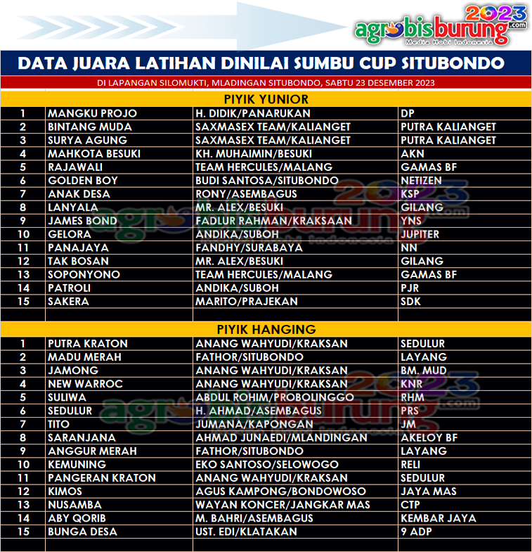 Di kelas piyik hanging, debutan belia Putra Kraton bergelang Sedulur milik Anag Wahyudi dari Kraksaaan menjadi yang terbaik pertama di kelasnya dan disusul Madu Merah bergealng Layang dan Jamong bergelang BM MUD diposisi kedua dan ketiga. AB-END