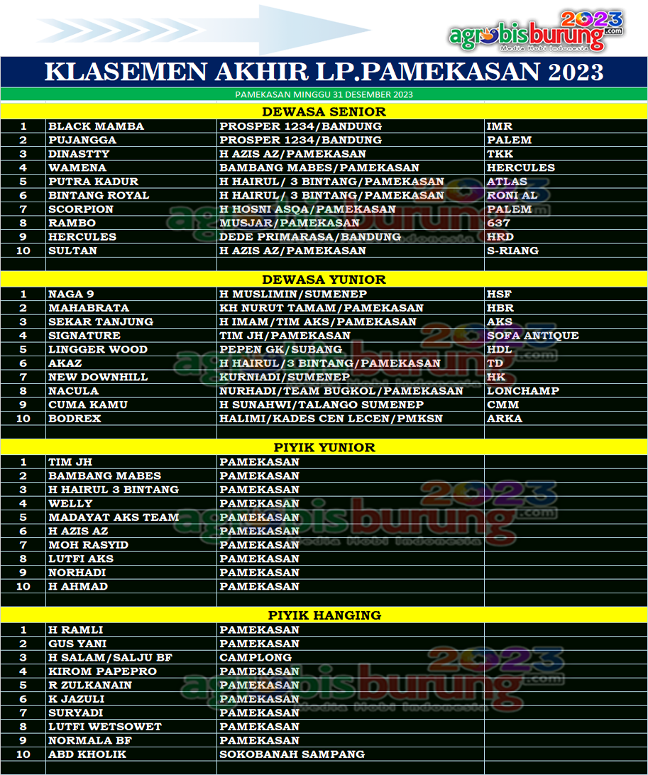 Headline Hobi Burung Juara Organizer Perkutut Perkutut Profil Tokoh Data Juara & Klasemen Akhir LP. Pamekasan 2023 Di Pamekasan, Minggu 31 Desember agrobisburung 31 Desember 2023 Kru Panitia LP Pamekasan 2023 PAMEKASAN, agrobisburung.com –Data Juara & Klasemen Akhir LP. Pamekasan 2023 Di Pamekasan, Minggu 31 Desember Tinggalkan Komentar Post navigation Previous: Tutup Tahun 2023, Jawara Tombo Ati & Cocal Cola tampil Terpesona di Latihan Dinilai Pengda Kab. TangerangNext: Putra Kadur Lagi Lagi Naik Podium 1, Senandung Rindu, Jalur Langit & Vaganza Rebut poin kemenangan di LP. Pamekasan # 8 Pengcam Pakong Pamekasan More Stories Headline Juara Perkutut WAT BF Tasikmalaya “Upgrade” Formasi Kandang Secara Berkala untuk Tingkatkan Kualitas Produksi, Daftar Bookingan Merata & Stok Anakan Selalu “Sold Out” agrobisburung 25 Februari 2026 Headline Organizer Perkutut Hasil Musda Jombang 2026, Agung Hariadi Terpilih Jadi Ketua Baru Pengda Jombang Secara Aklamasi & Siap Lanjutkan Program Ketua Lama agrobisburung 20 Februari 2026 Headline Perkutut Profil WAT BF Tasikmalaya Rilis 69 Kandang Terbaru, “Final Update Season Imlek-Awal Puasa 2026” & Gelar Promo Spesial Selama Sepekan agrobisburung 18 Februari 2026